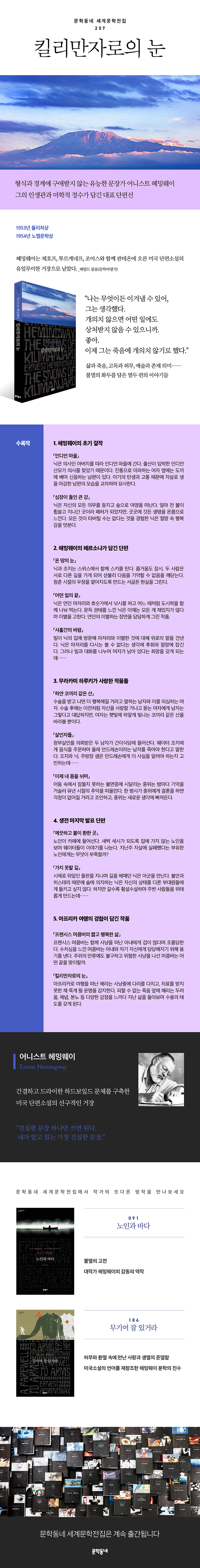 문학동네 세계문학전집 257번으로 출간된 『킬리만자로의 눈』에는 초기 단편 「인디언 마을」부터 마지막 단편 「프랜시스 머콤버의 짧고 행복한 삶」까지 헤밍웨이의 필치가 가장 잘 드러난 작품 12편을 모았다. 헤밍웨이는 서구의 기존 제도에 의문을 제기하는 모더니즘 사조를 토대로 자신만의 개성을 만들어나갔고, “빙산의 움직임이 위엄 있는 것은 그 팔분의 일만이 물위에 있기 때문”이라며 생략의 미학을 추구했다. 수록작 「인디언 마을」 「하얀 코끼리 같은 산」 「이제 내 몸을 뉘며」 「깨끗하고 불이 환한 곳」 등에서 이러한 헤밍웨이 미학의 본질을 만나볼 수 있다.