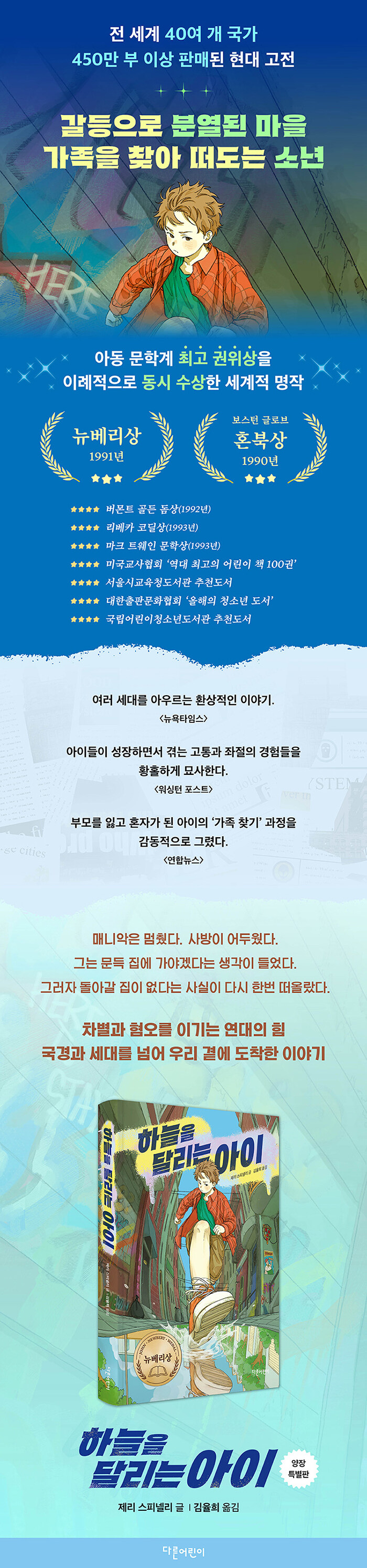 그래서 한 문학평론가는 이렇게 저자를 격찬했다. “제리 스피넬리는 아이들을 섣불리 판단하지도 않고 교훈적으로 질책하지도 않는다. 대신 그 자신의 요술 가방(작품)에 든 등장인물들을 마구 흔들어서, 가방에서 무엇이 넘쳐 나오는지 아이들이 지켜보기를 오히려 더 좋아한다.” 이것이 저자에게 열광하는 수많은 독자가 있는 이유다.